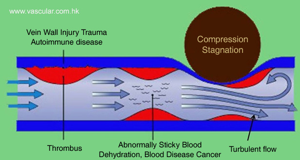 - During walking as muscle contract blood inside the deep vein is squeezed and pushed upward. When the legs are inactive, blood stagnate in the deep veins and clotted. The longer the period of stagnation, the more likely is thrombosis. E.g. long-haul flight