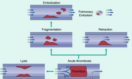 - Clot (thrombus) can dislodge from the vein, and carried along the blood flow through the heart to lodge in the lungs.