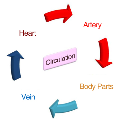 Heart pumps oxygen-rich blood through a network of arteries to provide the needed nutrient and oxygen to all body parts. Veins return blood from body tissue to be enriched with oxygen again and re-pumped by the heart. Essentially, blood flows down our legs through arteries, and up to the legs via veins back to the heart.