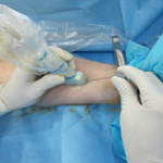 - Invagination stripping: The channel of reflux is removed (stripped). A "PIN stripper" is inserted through the cut end and advanced along the main trunk of the superficial vein. The end of the PIN stripperis sewn to the end of the vein. The tip of the stripper is perforated through the skin at knee level and the stripper is removed. The vein is pulled in on itself and is "stripped" stripped inside-out through a 2mm puncture wound at just below the knee level